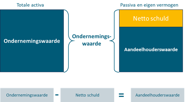 Zoals hierboven staat beschreven is de aandeelhouderswaarde de waarde die zich specifiek richt op de marktwaarde van het eigen vermogen c.q. de aandelen in uw bedrijf. Om deze aandeelhouderswaarde te berekenen dient u rekening te houden met de net debt positie, ook bekend als de equity bridge. Zo brengt u bijvoorbeeld rentedragende schulden in mindering, telt u de (overtollige) liquide middelen en voert u een correctie voor een genormaliseerd werkkapitaal (mogelijk) door.